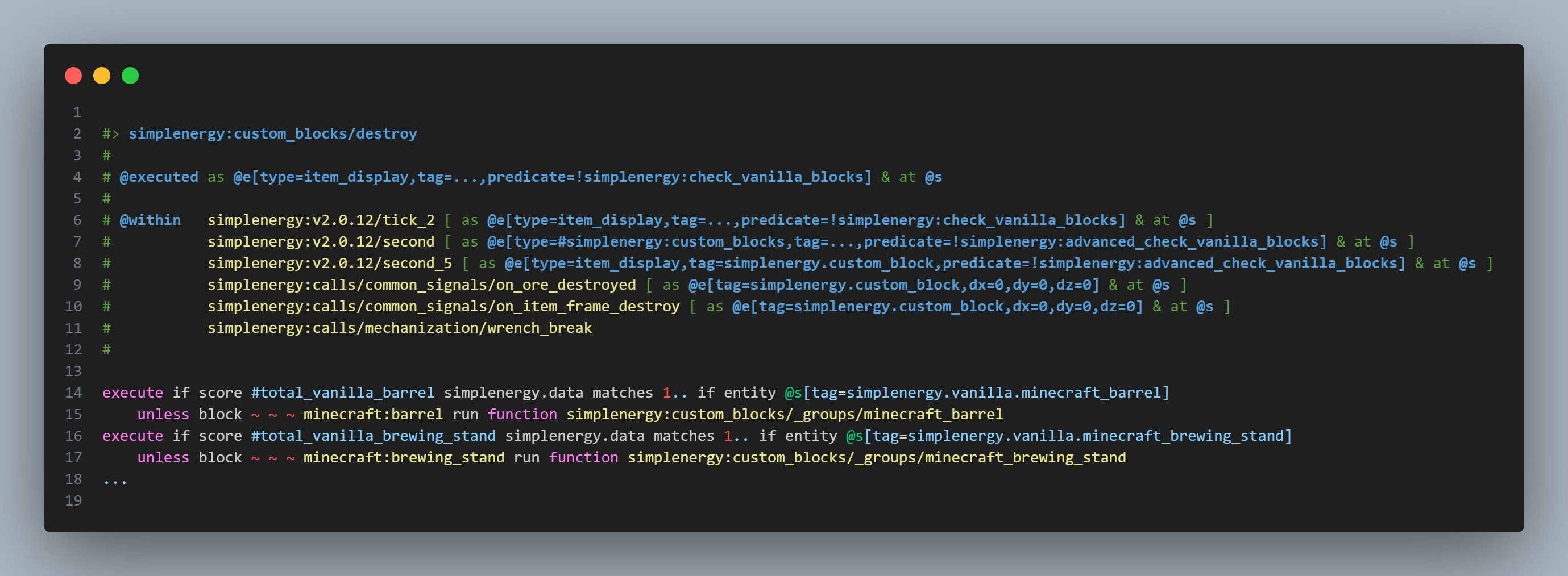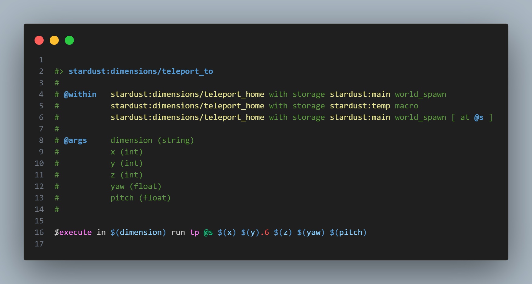 # Direct NBT call function namespace:target {x:10,y:20.5f,name:"Player"} # → Infers: x (int), y (float), name (string) # Storage-based call data modify storage temp:data macro set value {dimension:"minecraft:overworld",x:0,y:64,z:0} function namespace:teleport with storage temp:data macro # → Infers: dimension (string), x (int), y (int), z (int) # Type inheritance function caller {result:$(value)} # If caller has @args with value (int), target inherits: result (int)