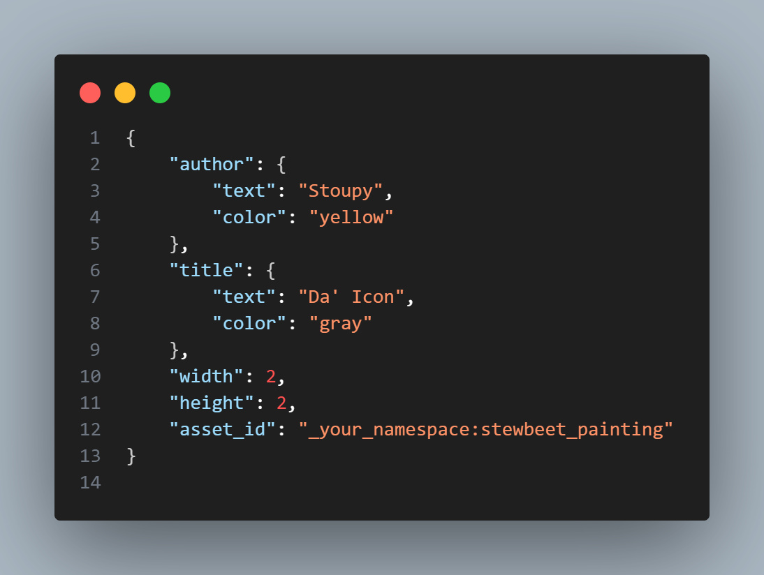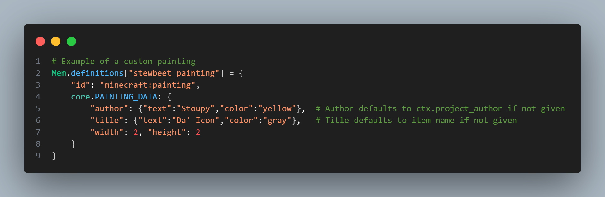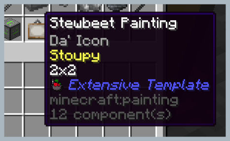 # Example from setup_definitions.py Mem.definitions["stewbeet_painting"] = { "id": "minecraft:painting", core.PAINTING_DATA: { "author": {"text":"Stoupy","color":"yellow"}, # Optional: defaults to project_author "title": {"text":"Da' Icon","color":"gray"}, # Optional: defaults to item name "width": 2, # Required: painting width in blocks "height": 2 # Required: painting height in blocks } }