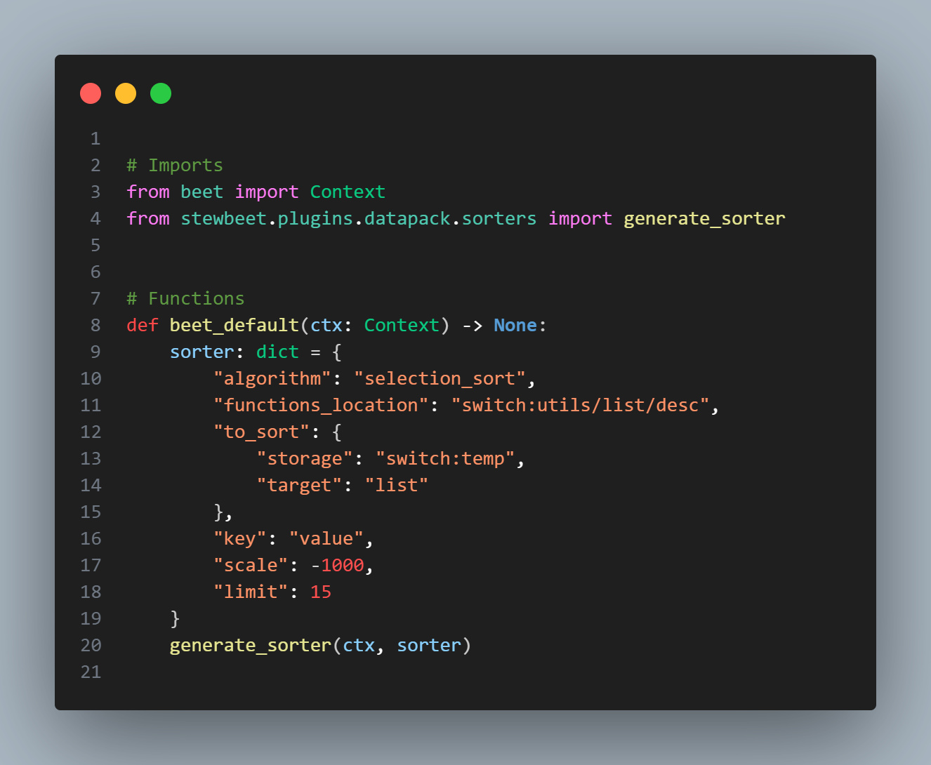 require: - ... - stewbeet.plugins.datapack.sorters.extend_datapack # Required: register "data/<namespace>/sorter/" as a custom resource - ... pipeline: - ... - stewbeet.plugins.datapack.sorters # Place this plugin in the pipeline - ... # Other plugins follow